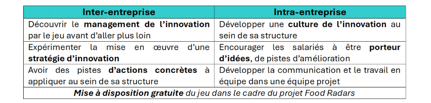 Pour le projet Food RADARS, ce Serious Game est un premier pas vers une structuration durable de l’innovation en entreprise. Il permet de :